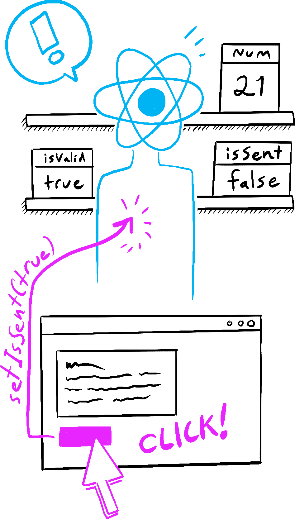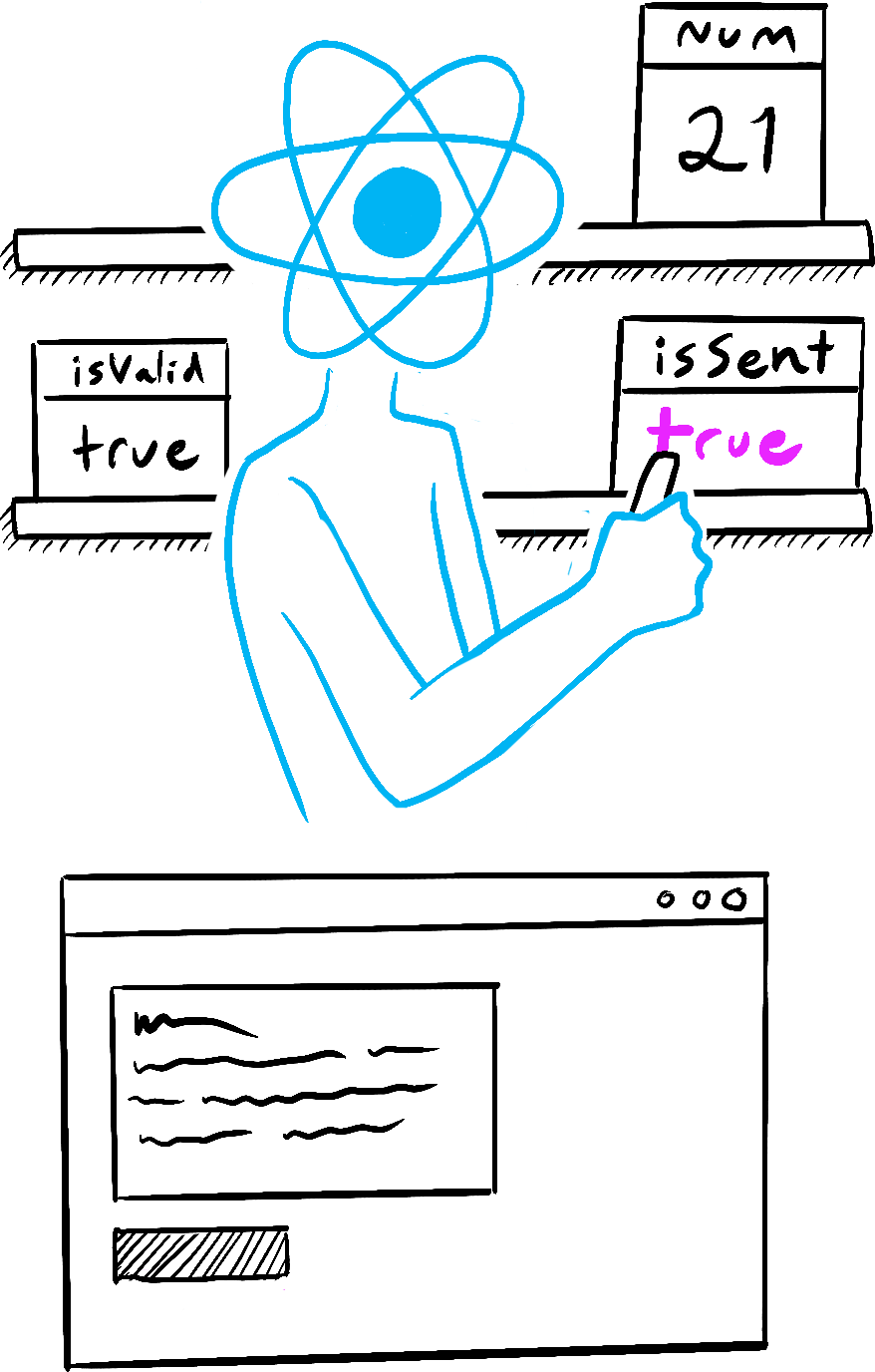 - Voit havainnollistaa tilan tapahtumankäsittelijöissä samalla tavalla kuin ajattelet renderöidystä JSX:stä.